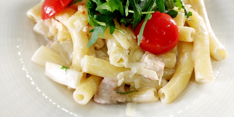 "PASTA BIANCA AL SALMONE E ASPARAGI" Salmon | Cream | Asparagus | Chervil | Grana padano | Rocket15.5- fish